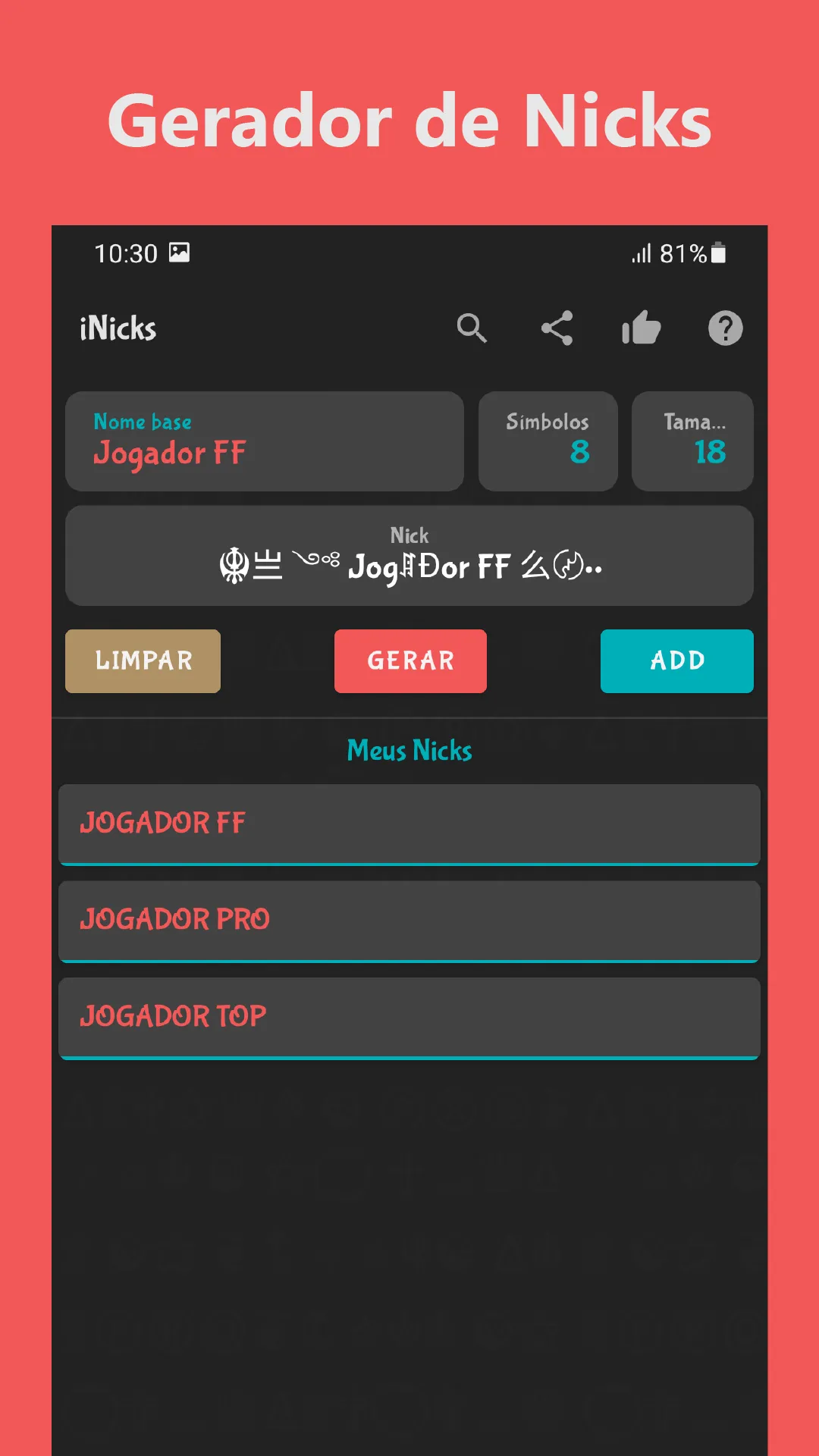 Gerador de nicks para seus jogos, com diversos símbolos e letras especiais.